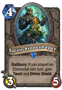- Tol'vir Stoneshaper – With an Elemental activator, especially with an Elemental 3-drop. Tar Creeper into Tol’vir Stoneshaper is the best anti-Aggro curve you can have, it’s really hard for them to pass through.