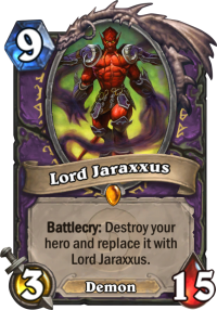 Another win condition is Lord Jaraxxus. It’s best in the long, grindy games against opponents that can’t burst you down from 15. Lord Jaraxxus is like an auto win against Priest or Reno Mage (if you force out some burn earlier). It was also the best win condition in Control Warrior, but the deck is pretty much nonexistent right now.