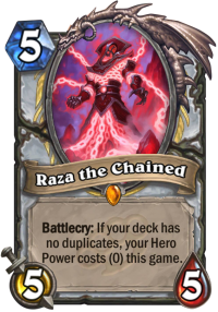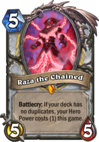 - Raza the Chained is a great card in this matchup too. If you get ahead or at least stay even, the extra free Hero Power each turn will matter a lot. This matchup is often decided by the mid game tempo and thanks to Raza, you can constantly keep your minions healthy while developing on curve at the same time. If your opponent will want to develop on the curve too, he will have to drop the healing instead.