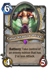 Cabal Shadow Priest tends to be good in the Aggro matchups, at least those who aren’t all-in face decks like Odd Face Hunter. You can steal most of their 1-drops and 2-drops, some of which even have Taunt. E.g. stealing a Righteous Protector vs Odd Paladin or Vulgar Homunculus against Zoo Warlock. But don’t really be picky about it – even stealing a 1/1 on the curve is better than keeping it if you have no other good plays anyway. Every card that can clear a small minion right away is good.