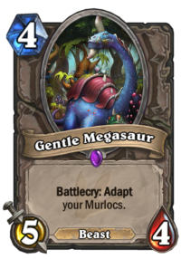 - Gentle Megasaur – Landing a Megasaur on a board for of Murlocs can be game ending. Even with only a couple in play, this 4 mana 5/4 can turn the tide of a game.