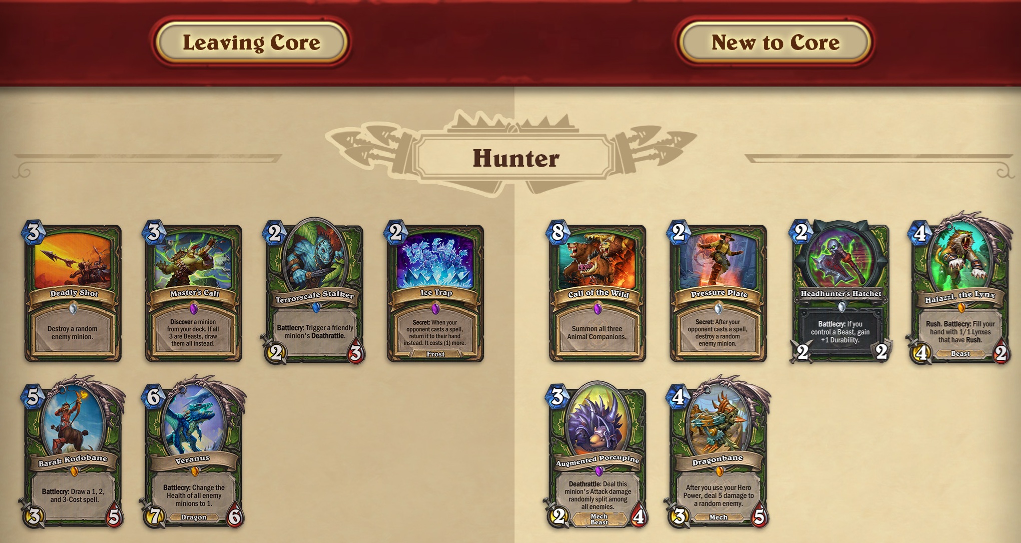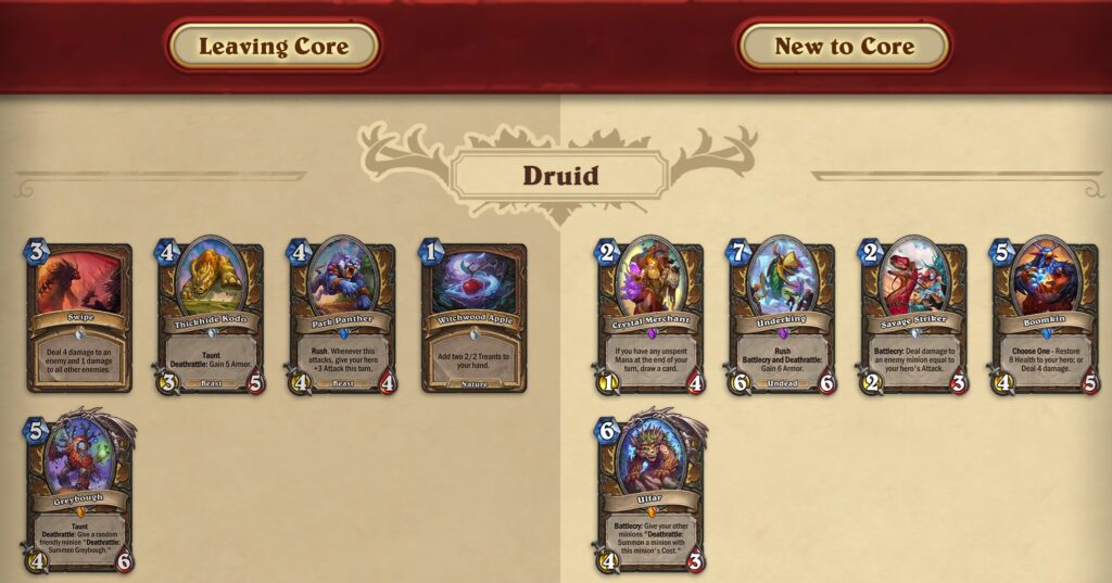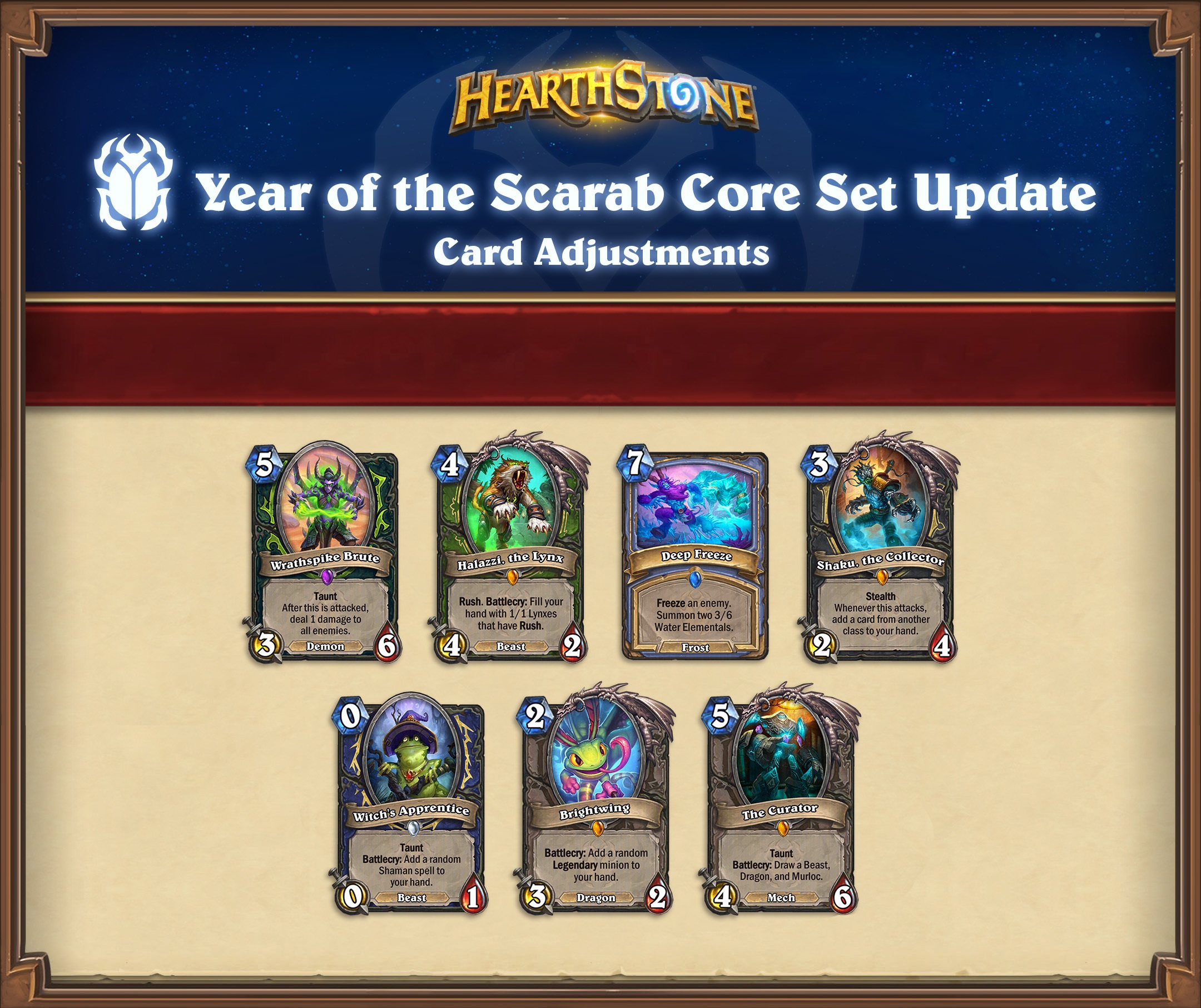 This time the Core Set rotation will be very light on card buffs. Only 7 cards are getting changed, one of which is a text-only change (The Curator got its wording adjusted). Out of all the buffs, I think that Shaman’s Witch's Apprentice has to be the most interesting one, as the card went down from 1 to 0 mana.