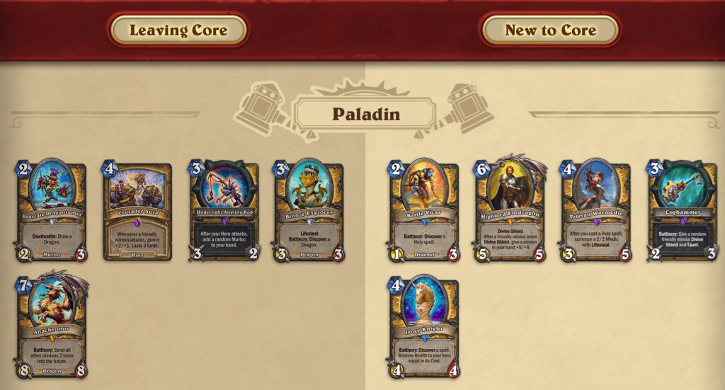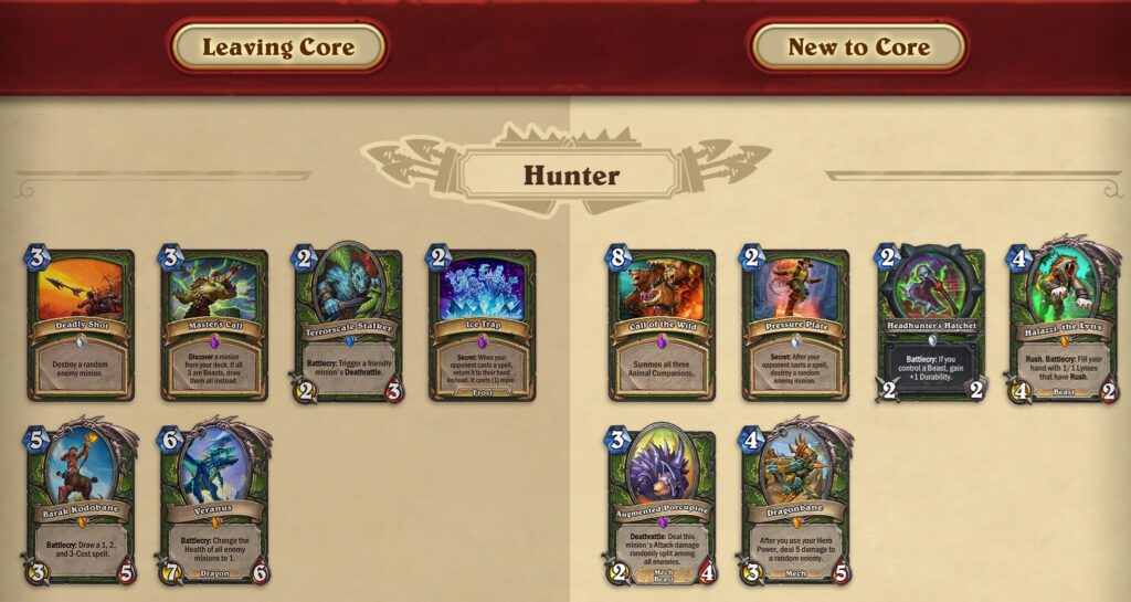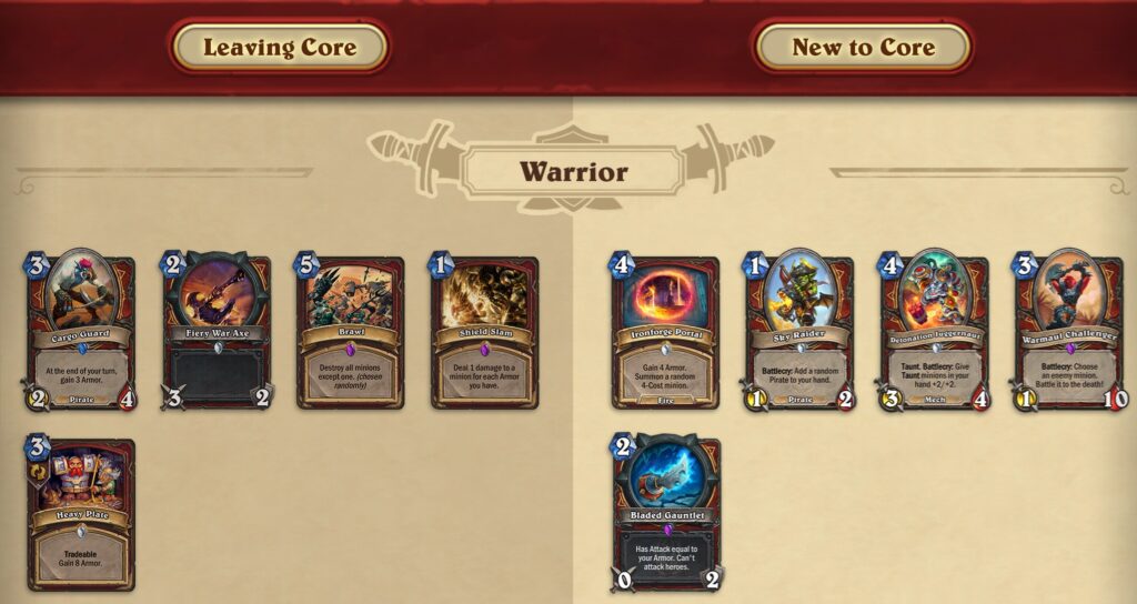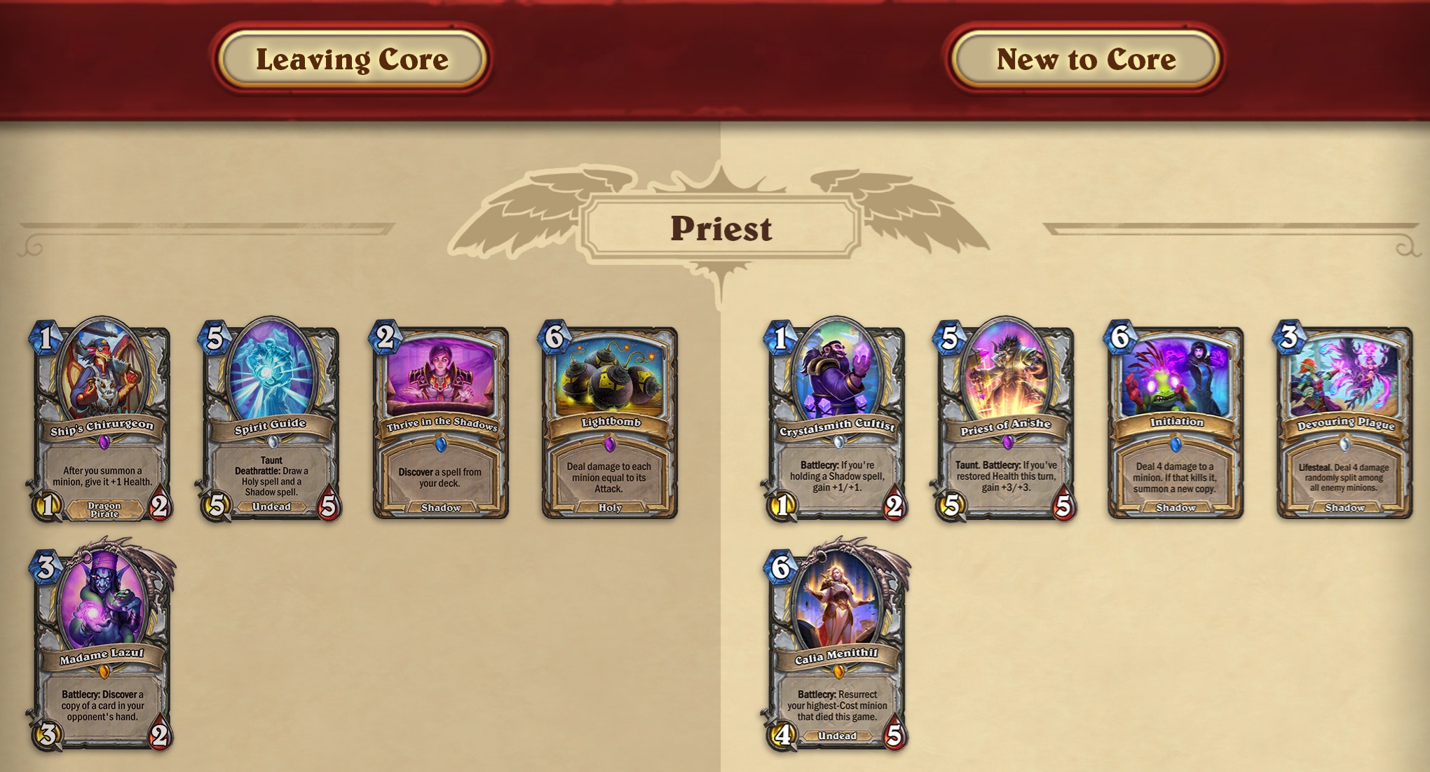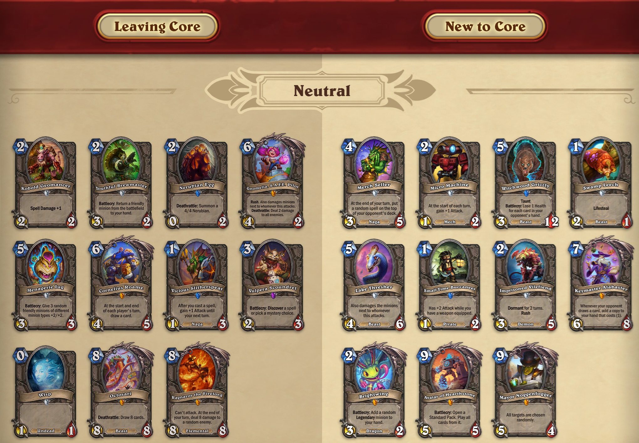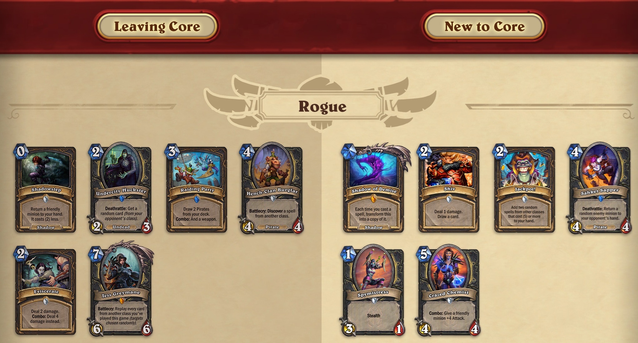 We’re also getting quite a lot of staple cards rotating out. The biggest one is definitely Shadowstep, but here are some other notable exclusions: Swipe, Brawl, Shield Slam, Corpse Explosion, Stitched Giant, Arcane Artificer, Crusader Aura, Eviscerate, Al'Akir the Windlord, and Gnomelia, S.A.F.E. Pilot. As you can see, a lot of high power level Core cards that have seen a lot of play during their time in Standard will be gone after rotation.