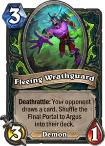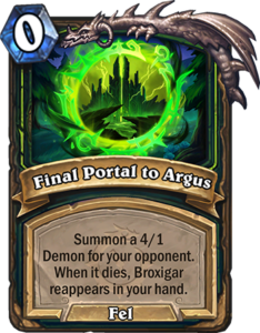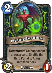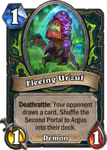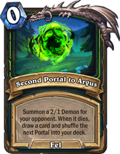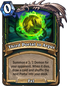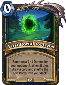 | First Portal to Argus Type: Spell - Cost: 0 Summon a 1/1 Demon for your opponent. When it dies, draw a card and shuffle next Portal into your deck. |
