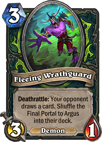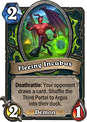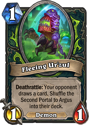 | First Portal to Argus Type: Spell - Cost: 0 Summon a 1/1 Demon for your opponent. When it dies, draw a card and shuffle next Portal into your deck. |
