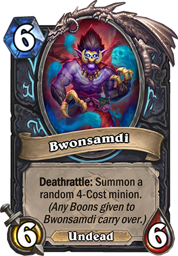 Deathrattle: Summon a random 4-Cost minion. (Any Boons given to Bwonsamdi carry over.)