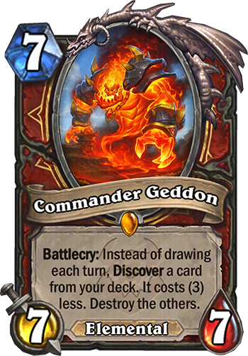 Commander Geddon is a 7 Mana Cost Legendary Warrior Minion Elemental card from the CATACLYSM set!
