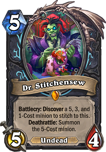 Battlecry: Discover a 5, 3, and 1-Cost minion to stitch to this. Deathrattle: Summon the 5-Cost minion.