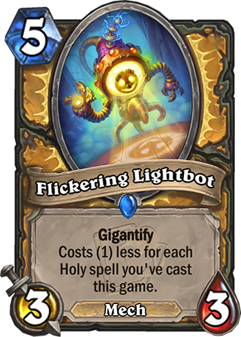 Flickering Lightbot is a 5 Mana Cost Rare Paladin Minion Mech card from the Dr. Boom's Incredible Inventions set!