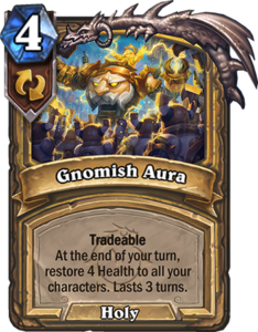 | Gnomish Aura Type: Spell - Cost: 4 Tradeable At the end of your turn, restore 4 Health to all your characters. Lasts 3 turns. |