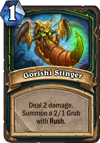 | Gorishi Wasp Type: Minion - Cost: 5 - Attack: 2 - Health: 7 Rush. Whenever this takes damage, get a 1-Cost Gorishi Stinger. |