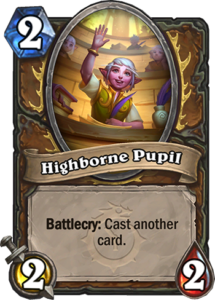 | Highborne Pupil Type: Minion - Cost: 2 - Attack: 2 - Health: 2 Battlecry: Cast another spell. |