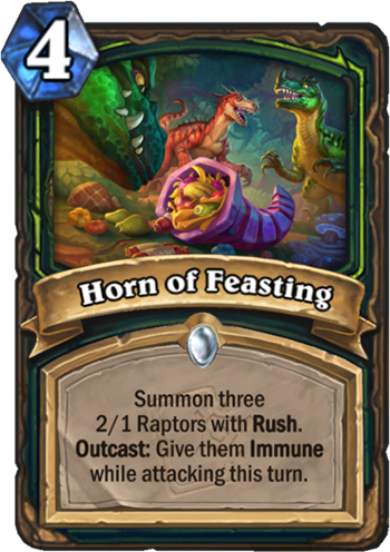 Summon three 2/1 Raptors with Rush. Outcast: Give them Immune while attacking this turn.