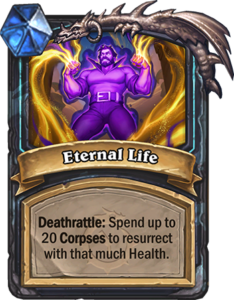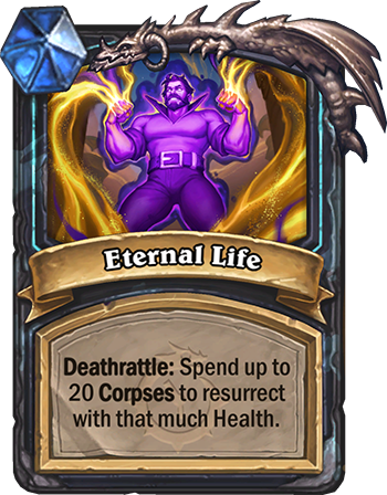 Battlecry:Give your hero "Deathrattle: Spend up to 20 Corpses to resurrect with that much Health."