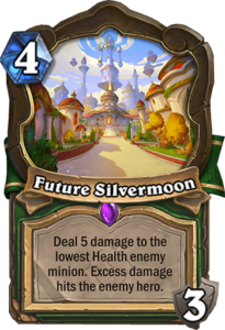 | Future Silvermoon Type: Location - Cost: 4 - Durability: 3 Deal 5 damage to the lowest Health enemy minion. Excess damage hits the enemy hero. |