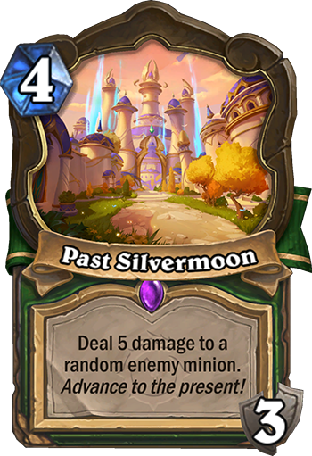 | Present Silvermoon Type: Location - Cost: 4 - Durability: 3 Deal 5 damage to a random enemy minion. Excess hits the enemy hero. Advance to the future! |