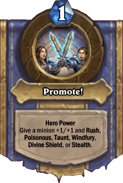 Promote! is a 1 Mana Cost Free Neutral Hero Power card from the Duels set!