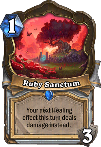 Ruby Sanctum Ruby Sanctum is a 1 Mana Cost Rare Priest Location card from the CATACLYSM set! Card Text Your next Healing effect this turn deals damage instead. Mana Cost: 1 Crafting Cost: 100 / 800 (Golden) Arcane Dust Gained: 20 / 100 (Golden) Rarity: RareClass: PriestCard Type: LocationSet: CATACLYSM Tweet Rate this Card Rate this item:1.002.003.004.005.00Submit Rating Rating: 4.6/5. From 45 votes. Please wait... By: Stonekeep - February 20, 2026 - Updated: 19 hours ago