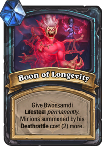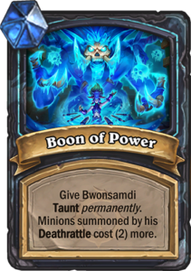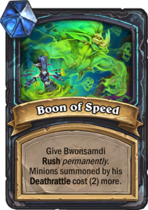 | Bwonsamdi Type: Minion - Cost: 6 - Attack: 6 - Health: 6 Deathrattle: Summon a random 4-Cost minion. (Any Boons given to Bwonsamdi carry over.) |