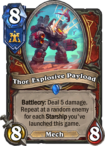 | Thor Type: Minion - Cost: 8 - Attack: 8 - Health: 8 Battlecry: Deal 5 damage. (Transforms if you launched a Starship this game.) |
