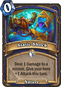 | Static Shock Type: Spell - Cost: 0 Deal 1 damage to a minion. Give your hero +1 Attack this turn. |