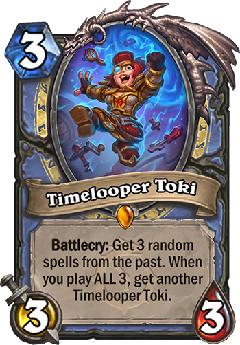 Battlecry: Get 3 random spells from the past. When you play ALL 3, get another Timelooper Toki.