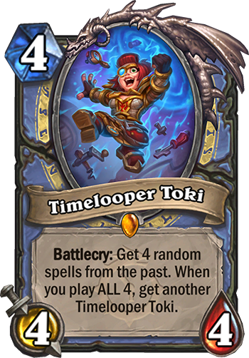 Battlecry: Get 4 random spells from the past. When you play ALL 4, get another Timelooper Toki.