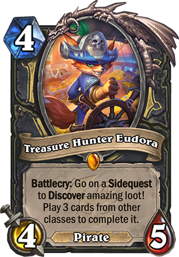 Treasure Hunter Eudora is a 4 Mana Cost Legendary Mage, Paladin, Rogue Minion Pirate card from the Perils in Paradise set!