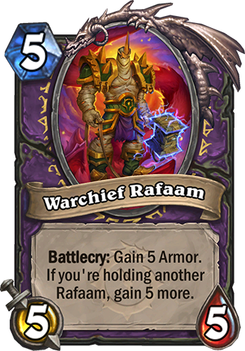 Battlecry: Gain 5 Armor. If you're holding another Rafaam, gain 5 more.