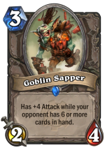 El deck consiste en llenar la mano del oponente para que cartas como “goblin sapper” obtengan bonificaciones. Además puedes quemarle cartas debido al exceso de robos del oponente, lo que le obligará a jugar las cartas que pueda. Por ello estoy comprobando si añado cartas como Second-Rate Bruiser