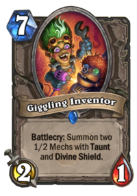 A card I particularly like in this deck is Giggling Inventor. I think it might be one of the strongest cards in the entire set. 2/1 + 2x Annoy-o-Tron is worth 5 mana combined, but combining cards like that usually add one or two extra mana to the cost. This one doesn’t. The card is like a post-nerf Call to Arms, but it’s Neutral, so every class can use it. While post-nerf Call to Arms is not as broken as the pre-nerf version, the card is still quite good in the right deck, and many classes would love to play it. If I had to make one bold statement about the expansion, I feel like Giggling Inventor might be nerfed to 6 mana after a while. But of course, I might also be completely wrong.