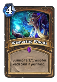 Wispering Woods is another spell that profits from a lot of cards in hand. For 4 mana, you only need to have four other cards in hand to make this comparable to a card like Stand Against Darkness. Druid of course has not as many tools to buff its token on board as Dude Paladin has, but again, if you have played Witchwood Apple on turn 2 or 3, this card easily creates six or seven wisps on the board. With that in mind, Power of the Wild and Branching Paths can easily bolster up this powerful board state even more which creates a solid answer to Aggro archetypes like Dude Paladin or Tempo Warrior. It is also possible to tech in a Savage Roar which makes Wispering Woods a legit threat that could represent 23 damage on board on turn 5 if seven wisps are in play.