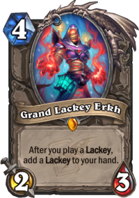 The only deck I could realistically want to put him into is the Warlock Lackey deck with Dark Pharaoh Tekahn. The Lackey package with Tekahn has seen some brief play in Zoo Warlock, and I’ve also seen some Midrange builds around it. Erkh would be significantly stronger in that build, because Lackeys would be a 4/4 instead of 1/1. It would be a massive late game win condition, flooding the board with 4/4’s. But I don’t think that the deck is going to work, unless Warlock gets something interesting.