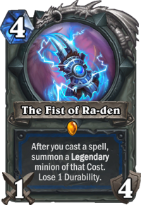 However, the archetype and a card I like Fist of Ra-Den with is Control Shaman and Earthquake respectively. Control Shaman might not be in a best spot right now, but I’m thinking more about the future. Since we’ve already been through all of the Token & Midrange Shaman builds, maybe Blizzard decides to push Control again next expansion. And Fist of Ra-Den would be a PERFECT card in Control build. Earthquake is already a solid card – it’s a big board clear, 7 damage for 7 mana is enough to clear most of stuff. But you’re usually left with no board whatsoever after playing it. And here’s where Fist would shine – you would summon a random 7-drop, giving you a huge board control lead. Now next turn your opponent might play something, you would clear it with another spell or two, summon more minions, and basically gain a total control of the game. The deck also runs some cheaper, but not VERY cheap spells, such as Lightning Storm or Hex, which would also add some power to the board.