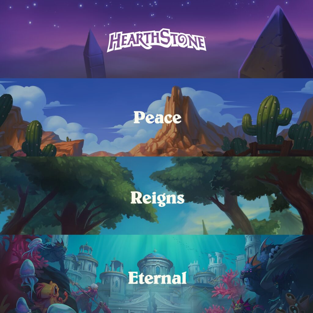The teaser image shows three locations from previous Hearthstone expansions Badlands (Showdown in the Badlands), Elwynn Forest (United in Stormwind) and Zin-Azshari (Voyage to the Sunken City). There’s also the top part with sky and some spires/obelisks, but I can’t quite place it just from this image. (Edit: Some people suggested that it looks like Uldum, so maybe we can throw in Saviors of Uldum to the mix!)