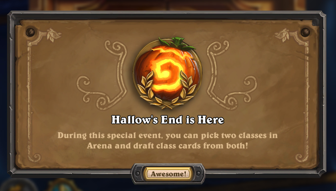 The Hearthstone Hallow’s End event has begun and with it comes a special Arena where you get to choose a Hero, then choose a Hero Power, and then draft cards from both classes! You will also receive one free Arena ticket, as well as two free packs of Whispers of the Old Gods just for logging in! On October 25th, we will also be getting a Hallow’s end themed Tavern Brawl featuring the Headless Horseman.