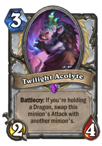 An excellent card for the controlling Dragon Priest deck. Highlander variant or not, this card makes the cut in all of them because it’s just that good. The immediate comparison appears to be Aldor Peacekeeper and Twilight Acolyte is miles ahead – the baseline of the Battlecry effect is almost the same, however its implications are far greater. To start with, it means that Acolyte’s attack actually grows, unlike Peacekeeper, turning it into a sizeable threat every time it deals with one and the 4 health means that most often the thing it just hit won’t be able to retaliate against the Acolyte on its own or even with a ping hero power (Druid, Rogue, Mage). Furthermore, because of class context, reducing an enemy minion’s attack to 2 is a lot more significant of an effect that it is on the Peacekeeper. He is usually paired with Stampeding Kodo, which also works with Twilight Acolyte, however it also enables combos with Potion of Madness and Cabal Shadow Priest. While the latter does not always make the cut in Priest decks (even though this card is a wonderful incentive), Potion is played in every single Priest deck and for good reason. Twilight Acolyte is well positioned to become a real meta-defining card and as a control player at heart, I couldn’t be more excited to play with something so flavorful and powerful.