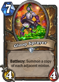 Gloop Sprayer is like a definition of win-more card. When you’re behind on the board, it’s basically unplayable. When you have only small minions – it’s meh. When you have a single bigger minion – it’s also meh. In order to take full advantage of it, you need to have two big minions you want to copy. But if you have two big minions on the board, the chances are that you’re already winning. Reducing his mana cost by 1 didn’t change much in that department. Of course, making it 7 instead of 8 means that you can play him more easily. Or possibly even fit a 3-drop in the same turn, so even with just a single minion on the board you can still take bigger advantage of it.