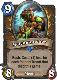 Of course, The Forest's Aid made it much easier to play a cheap or even free Mulchmuncher, but… again, in the late game. Let’s say that you play Aid on T8, everything dies, you do the same thing on T9, everything dies. You now have a free Mulchmuncher. But it’s Turn 10 already. If you just drew it, then it’s great, but if you were holding it from the beginning of the game, you’d rather it be any other card that could maybe get you back into the game earlier. And reducing its mana cost by 1 didn’t really change much. It was a fringe card before, and it’s still a fringe card.