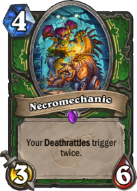 When it comes to pre-patch rankings, Necromechanic was definitely one of the highest cards on the list for many players. It was already almost playable at 5 mana, and buffing it to 4 made it really powerful. 3/6 are premium stats for a 4-drop (for a card with an ongoing effect, they’re even better than 4/5, because it’s harder to kill) and the text on a card is also something you can’t possibly ignore. It’s like a good old Baron Rivendare, but that one had nearly unplayable 1/7 stats (it also worked only on minions, as opposed to all Deathrattles, which is pretty relevant with Nine Lives).