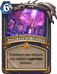 One of the Shaman’s theme is Evolving minions. It started way back in Whispers of the Old Gods with Evolve, then we’ve got cards like Unstable Evolution or Thrall, Deathseer. While most of those are out of Standard now (with Mutate being the only one left), we have a slightly different kind of “Evolve” effect too – The Storm Bringer. Most of the time, Evolve effects worked best on small minions with high mana cost – this way you could turn a small body (e.g. Doppelgangster) into something bigger (e.g. Boulderfist Ogre), thus upgrading your board significantly. Storm Bringer, while it fits a similar style of decks, works a bit differently. Instead of small minion with high mana cost, you want JUST small minion – no matter if it costs 0 or 5 mana. And that’s what the card excels at – turning a board of small minions, especially tokens, into random Legendaries. Of course, given that Blizzard has been printing many smaller/lower impact Legendaries in the past few sets, a “random Legendary” is no longer as menacing as it used to be. But it’s still a huge improvement over 1/1’s, for example.