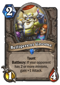 I agree in that I think Belligerent Gnome will shine in a meta without Keleseth, because what deck besides Zoolock these days consistently has 2 minions out on turn 2? However, even with rotation shuffling out its competition in Tar Creeper and Keleseth, this card will probably not consistently trigger when you go first unless a neutral 1-drop that summons another minion like Alleycat gets printed. I really want to like him, but I’m both worried and intrigued that he’s strongest when you’re going second in a meta that actually runs 2-drops.