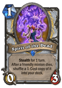 First and foremost – it’s a 1 mana 0/3 with Stealth. That alone can make it usable in… Combo Priest. Since minions in Stealth are generally hard to kill, and Combo Priest is often about sticking a minion on the board, this can be used to do it. Power Word: Shield + 2x Divine Spirit + Inner Fire creates a 20/20. Of course, it’s not the best combo target, you’d rather do it on an 8 health Twilight Drake for example, but it can be a nice backup plan if you can’t stick a minion and you’re holding your combo pieces. You can already sort of have a backup plan like that with Stormwind Knight, but the problem is that you need to do it all on the same turn – to get to the same 20 damage, you need 9 mana (2x Divine Spirit + Inner Fire), while Spirit of the Dead can be dropped on T5 and you can combo on T6, that’s a significant difference.