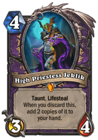 But like I’ve said, I don’t think that it’s worth the discard, especially in a world where Tar Creeper exists. If anything, you might want to play this in a deck that WANTS to discard stuff – either a Quest Warlock (which I still don’t believe will work, because it doesn’t suffer from lack of ways to trigger the quest, it’s just too slow and clunky in general) or a regular Discard deck, running Discard-matter cards, such as Clutchmother Zavas or the new High Priestess Jeklik.