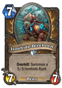 It’s a broken Arena card, and I mean it. Arena is a format where War Golem is a decent card (just about average), and single target removals aren’t that common. So this is AT WORST an average card, and at best a War Golem + a bunch of 5/5’s. Summoning just a single 5/5 makes this card top tier, and it’s not going to be that difficult. All you need to run it into a 6 or less health minion. It doesn’t even have to survive – minions still trigger their Overkill effects if they die while making the attack. In the late game, it might stop your opponent from playing small and midrange minion completely, so if he doesn’t have a big bomb or a removal he might be blocked out of the game.