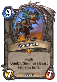 I’m 99% sure that this card will see play. Deathrattle Hunter is an already existing, strong archetype and it fits right in. The deck runs Kathrena Winterwisp and a small (in quantity, not mana cost) Beast package – usually 4 minions. Kathrena is obviously an insane tempo play – given that the Beasts deck runs cost 6 to 9 mana, the card pulls two huge bodies on top of the 6/6. However, drawing some of the Beasts before playing Kathrena can get pretty awkward. For example, Witchwood Grizzly is still great vs Aggro when they run out of cards, but it can be nearly unplayable against slower decks. This could solve that issue – pulling it straight from your hand would give you some tempo and circumvent a negative Battlecry. Of course, getting Oondasta straight from Kathrena is great. It’s not as aggressive as King Krush or even Charged Devilsaur (which can go face in that case), but it creates an even harder to deal with board.