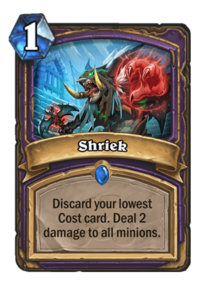 And to be absolutely honest, 4 mana 3/4 Taunt with Lifesteal is borderline playable already in a slower deck. It’s a Sen'jin Shieldmasta, where you trade 1 health for Lifesteal – not that bad of a deal. If you add something like Shriek to that deck, if you can play all of your smaller stuff and make her the lowest cost card in your hand, triggering this effect would be really solid.