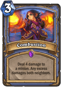 This card reminds me a bit of Rolling Fireball – not the effect itself, but the flexibility of removal. Rolling Fireball turned out to be one of the better Mage removals released lately, and that’s because it can be used both as a single target removal and as a pseudo-AoE. 8 damage to a minion for 5 mana is bad. So is 1 AoE damage for 5 mana (assuming your opponent has a board full of 1/1’s), for example. So would be a card that dealt 4 damage to two random minions. But the best thing about Rolling Fireball is that it combines all of those into a single card. Combustion is a bit similar in that manner.