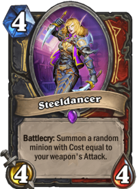 I’m on the fence about it. The biggest issue is that you ideally want to drop it on curve, since it seems like a solid tempo minion, but in order to do it, you need to have a weapon equipped already. In Rogue, that’s not a problem because of Hero Power, but then it will summon a random 1-drop, which is pretty bad (4/4 + 1-drop for 4 mana is meh). Like sure, if you get a Combo’d Hooked Scimitar up on 3 and then drop this on 4, that’s incredibly powerful. But I’m just not sure if it will be consistent enough. Waggle Pick also combos well with it, but it’s a super awkward curve unless you have a 1-drop to fill it with. Rogue doesn’t run weapons unless they’re really amazing (or well, if they have a good card to tutor them, like pre-nerf Raiding Party). And Warrior… well, in Warrior it would be nice with T3 Livewire Lance or Ancharrr. You get those on curve quite often, mostly because you also run Corsair Cache to tutor them. But even then, 4/4 + random 2-drop is solid, but not THAT powerful, and it only works if you happen to play weapon on curve.