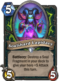 It’s the new Glaivebound Adept. It’s hard to say which one is better, honestly. 5/5 vs 6/4 – Lapidary probably wins, but not by much. 4 damage vs 5 damage – Lapidary wins again. But unlike Adept, it can’t bypass Taunts, which is a pretty big deal. On the other hand, Lapidary can combo with weapons like Warglaives of Azzinoth – e.g. to clear a big minion and swing face in the same turn. You need to attack to activate Adept, while you need to have Soul Fragments in deck to activate Lapidary. Overall the cards are similar, Lapidary is probably even better… but Glaivebound Adept is still one of the strongest Demon Hunter cards, so this comparison just shows how amazing the new card is.